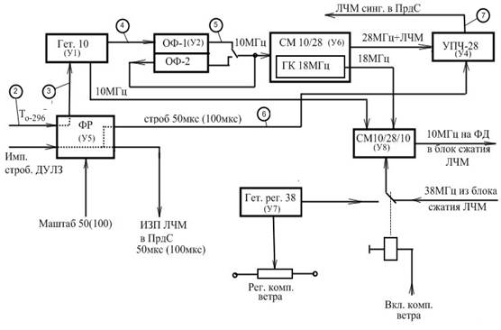 Кроме этого когерентное напряжение 10 МГц с Гетеродина -10 используется в качестве опорного напряжения в блоке сжатия принятого ЛЧМ сигнала. Для этого, непрерывное синусоидальное напряжение кварцевого генератора узла У1 частотой 10 МГц, поступающее на смеситель 10/28 узла У8, куда также поступает синусоидальное напряжение кварцевого генератора частотой 18 МГц из узла У6, что обеспечивает введение начальной фазы генератора частоты 18 МГц и последующее вычитание ее на фазовом детекторе блока сжатия ЛЧМ.
