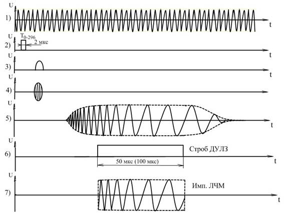 На выходе манипулятора Гетеродина 10 из непрерывного колебания кварцевого генератора формируется радиоимпульс с частотой заполнения 10,0МГц, соответствующей рабочей частоте ОФ (эпюра 4).