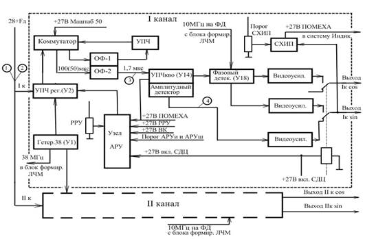 Блок обеспечивает усиление поступающих по двум каналам сигналов с оптимальным фильтром (ОФ), сжатия ЛЧМ сигналов на ОФ, квазивесовую обработку сжатых сигналов, детектирование сжатых сигналов в амплитудном и квадратурном фазовом детекторах, работу в амплитудном ( АР) или фазовом ( ФР) режимах, поддержание заданного уровня шумовой помехи, работу в режиме видеокомпенсации и выдачу команды «+27 В ПОМЕХА».