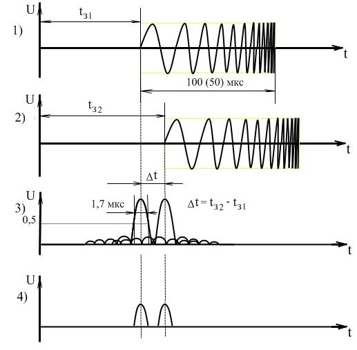 После усиления радиоимпульс подается на ОФ, на выходе которого получается отклик длительностью около 100мкс (эпюра 5) для «Масштаба 50 км», с изменяющейся в соответствии с дисперсионной характеристикой ОФ частотой внутри отклика (ЛЧМ отклик).