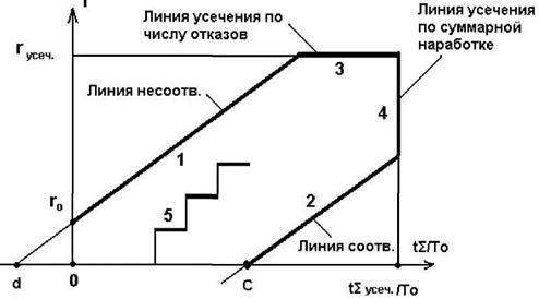 При наличии отказов изделий в процессе испытаний графиком последовательных испытаний является ступенчатая линия 5, сумма отрезков которой, параллельных оси tΣ/T0, численно равна отношению суммарной наработки изделий в данный момент времени t к значению То, а сумма отказов параллельная оси r, равна числу отказов изделий к моменту t.