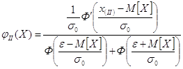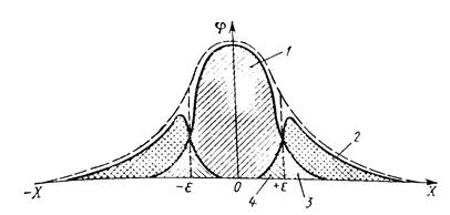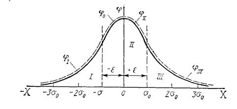 Процесс контроля и измерений в этом случае сводится к разделению площади, ограниченной исходной (в данном случае гауссовской) плотностью распределения вероятностей φ0(X) параметра Xи осью абсцисс, на три области. При этом в область II входят изделия, значения параметра которых находятся в пределах заданного поля допуска ±ε; в области I и III — изделия со значениями параметра, выходящими за левую и правую границы поля допуска соответственно. Плотность распределения вероятностей параметра годных изделий после их разбраковки