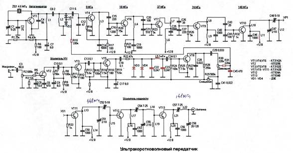 L2, VD1, VD2, C11, C12 – колебательный контур. При подаче модулирующего напряжения, варикапы изменяют свою емкость, следовательно меняются параметры контура и происходит модуляция.