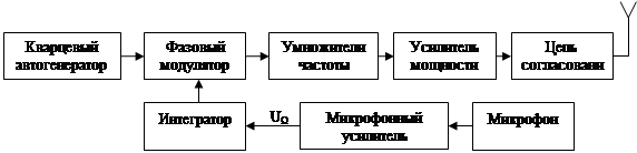 Из структурной схемы видно, что в передатчике используется косвенный метод получения ЧМ.