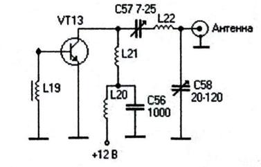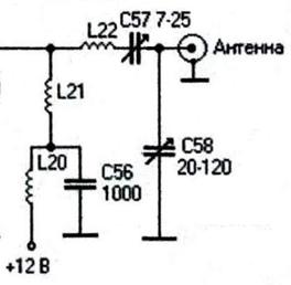 В данной схеме роль согласующего устройства играет параллельный колебательный контур L21-C57-L22-C58. Целесообразно поменять местами емкость C57 и индуктивность L22 (рис. 12).