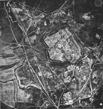 К центральному бугру городища примыкает территория, окруженная стеной, которая отчетливо видна на аэрофотоснимках, тогда как на местности заметны лишь ее отдельные участки. С северо-западной стороны к стене подходит современный поселок. Он расположен несколько ниже городища. Здесь стена имеет два прямоугольных выступа, видимо, вследствие естественного рельефа местности. Наибольшая удаленность ее от северного угла городища - 520 м. Стена сохранилась достаточно хорошо и представляет собой оплывший вал шириной 20-25 м и высотой 3-5 м. Снаружи ров на некоторых участках заболочен. Глубина его до 2 м, ширина 10-15 м. В стене заметен разрыв (ширина 10 м), здесь был въезд. По нему и в настоящее время проходит полевая в Шаульдер. Рядом с въездом находятся остатки сооружений в виде прямоугольного в плане бугра (150Х120Х2-2,5 м). В свою очередь он расчленен узкими углублениями на несколько всхолмлений, которые, видимо, соответствуют древней планировке улиц.