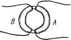 Из круглого брускового железа было сварено кольцо; толщина металла была равна семи восьмым дюйма, а наружный диаметр кольца — шести дюймам. На одну часть этого кольца было намотано три спирали, содержавшие каждая около двадцати четырех футов медной проволоки толщиной в одну двадцатую дюйма. Спирали были изолированы от железа и друг от друга и наложены одна на другую описанным выше способом, занимая приблизительно девять дюймов по длине кольца. Ими можно было пользоваться по отдельности и в соединении; эта группа обозначена буквой А (рис. 1). На другую часть кольца было намотано таким же способом около шестидесяти футов такой же медной проволоки в двух кусках, образовавших спираль В, которая имела одинаковое направление со спиралями А, но была отделена от них на каждом конце на протяжении приблизительно полудюйма голым железом.