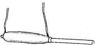 Однако, поскольку можно было бы предположить, что во всех предыдущих опытах, описанных в этой главе, мгновенный индуцированный ток возбуждался благодаря некоторому особому действию, имевшему место во время образования магнита, а не благодаря самому факту его приближения, то был произведен следующий опыт. Все тождественные концы составной полой спирали были соединены вместе медной проволокой, и образованные таким образом два главных вывода были связаны с гальванометром. Цилиндр из мягкого железа был заменен цилиндрическим магнитом в три четверти дюйма диаметром и в восемь с половиной дюймов длиной. Один конец этого магнита был введен внутрь спирали по ее оси (рис. 4), а затем, после того как стрелка гальванометра успокоилась, магнит был быстро вдвинут внутрь спирали; стрелка немедленно отклонялась в таком направлении, как если бы магнит был образован посредством одного из двух предыдущих процессов. При оставлении магнита внутри стрелка возвращалась в свое первоначальное положение, а при вытаскивании его отклонялась в противоположном направлении. Действия эти не были особенно сильны; однако, вдвигая и выдвигая магнит таким образом, чтобы каждый последующий толчок прибавлялся к произведенным уже ранее, удавалось сообщить стрелке колебания размахом в 180° и более.