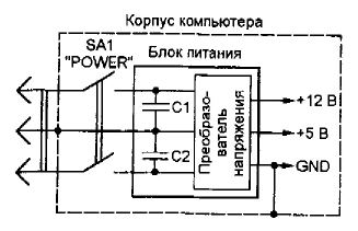 В большинстве блоков питания компьютеров на входе стоит элементарный фильтр, состоящий из двух конденсаторов, задача которого сводится к тому, чтобы не пропустить высокочастотную составляющую. Фильтр может быть и более продвинутым, включающим в себя катушки индуктивности (зависит от "серьезности" производителя БП), но, в большинстве случаев, это фильтр, показанный на рисунке. В результате, в зависимости от емкости конденсаторов, мы получаем на корпусе компьютера потенциал порядка 100 В относительно фазного (L) и нулевого (N) провода. Иначе говоря, при определенных условиях при прикосновении к корпусу компьютера можно получить удар электрическим током. Впрочем, в помещениях, где разводка сети выполнена по трехфазной схеме, ситуация гораздо хуже: разность потенциалов между корпусами компьютеров, сидящих на разных фазах, пойдет уже на сотни вольт. В результате, при объединении компьютеров, к примеру, в сеть, практически гарантированно получаем повреждение аппаратного обеспечения.