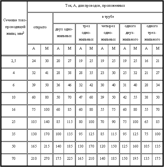 Допустимые длительные токи для проводов и шнуров в резиновой и ПВХ изоляции с алюминиевыми и медными жилами