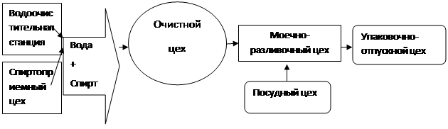 Водку приготовляют в очистном цехе. Спирт в очистной цех поступает из спиртоприемного цеха, а умягченная вода – с водоочистительной станции. Розлив водок в бутылки производится в моечно-разливочном цехе, куда стеклянная посуда подается из посудного цеха. Готовая продукция направляется в упаковочно-отпускной цех.