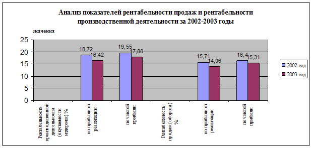 Диаграмма 2.1. Анализ показателей рентабельности продаж и производственной деятельности в 2002-2003гг.