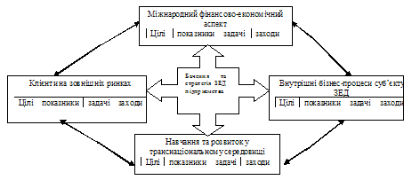 Однак невирішеним залишається питання формування моделі розробки стратегії зовнішньоекономічної діяльності підприємства на засадах створення системи збалансованих показників та комплексної оцінки економічної ефективності ЗЕД підприємства для довгострокового розвитку у сфері міжнародного бізнесу.