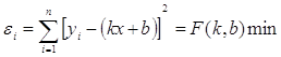 частіш за все користуються методом найменших квадратів. При цьому ставиться умова, щоб сума квадратів відхилень (відстаней) всіх досліджених точок від ординат, обчислених за рівнянням прямої εi, була мінімальною. Іншими словами, пряма повинна проходити якомога ближче до вершин емпіричної лінії регресії. Це означає, що параметри k і управління регресії треба визначити з рівняння: