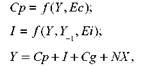 де Ср — обсяг приватного споживання; Y— обсяг ВВП; Ее, Ei —змінні, які характеризують вплив випадкових чинників на обсяги приватного споживання та обсяги інвестицій; І— обсяг інвестицій;Cg — обсяг державного споживання; NX— обсяг чистого експорту. Перше рівняння характеризує функціональну залежність між обсягом споживання, величинами національного доходу і чинниками стохастичної природи. Друге рівняння описує взаємозв'язок між обсягом інвестицій, поточним і попереднім національним доходом і впливом випадкових чинників. Третє рівняння — основна макроекономічна тотожність.