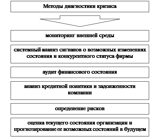 Диагностика кризисов в организации – это совокупность методов, направленных на выявление проблем, слабых и «узких» мест в системе управления, которые являются причинами неблагополучного финансового состояния и других негативных показателей деятельности (7, С.182). Диагностику можно понимать и как оценку деятельности компании с точки зрения получения общего управленческого эффекта, и как определение отклонений, существующих параметров системы от первоначально заданных, и как оценку функционирования организации в подвижной, изменяющейся внешней среде с целью предупреждения кризисов.