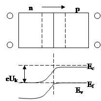 На зонній діаграмі спостерігається перепад потенціалу n та р областей. Прикладання зовнішньої напруги приводить до порушення рівноважного стану і зменшення контактної різниці потенціалів, якщо зовнішнє поле протидіє внутрішньому (до р++, до n--), і збільшення контактної різниці потенціалів, якщо зовнішнє поле спів напрямлене з внутрішнім.