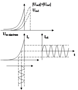 Оскільки концентрація носіїв в області емітера більша, то струм бази виходить на насичення. Надлишок інжектованих носіїв, маючи довжину вільного пробігу більшу за ширину бази, попадають в ОПЗ зворотно зміщеного колектора і екстрагуються в колекторну область. Тут вони взаємодіють з просторовим зарядом колекторного переходу, що приводить до зменшення потенціального бар'єру між колектором та базою, а відповідно до зростання колекторного струму.