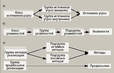 Уязвимости также можно разделить на классы по принадлежности к источнику уязвимостей, а классы на группы и подгруппы по проявлениям (рис.1.2б). Методы реализации можно разделить на группы по способам реализации (рис.1.2в). При этом необходимо учитывать, что само понятие «метод», применимо только при рассмотрении реализации угроз антропогенными источниками.