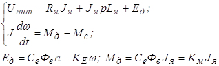Запишем уравнения элементов системы. Для двигателя постоянного тока с независимым возбуждением