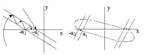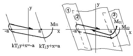 Это условие выполняется при y = 0, т.е. точка вырождается в прямую линию y = 0 на интервале (– а, а). Фазовые траектории на участке – а< x < a представляют собой прямые с коэффициентом наклона -1/Т1 при различных значениях начальных условий.