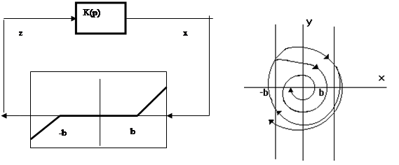 Пусть в области (-b, +b) система устойчива, при этом коэффициент усиления – К мал, переходный процесс затухает, особая точка "устойчивый фокус" вне области К – большой, переходный процесс расходится (рис. 22). Эта система имеет неустойчивый предельный цикл, т.е. автоколебания неустойчивы.
