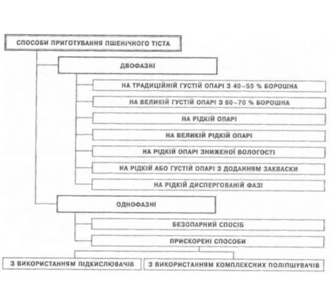 Тісто з пшеничного борошна готують двофазними або однофазними способами. Основні сучасні способи приготування тіста із пшеничного борошна представлені нарис. 6. /.
