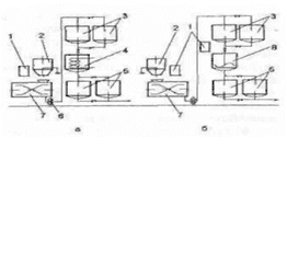 Рис. 6.2. Апаратурна схема приготування рідких дріжджів (а — за першим варіантом, 6 — за другим варіантом): 1 — водомірний бачок, 2 — автоборош-номір, 3 - ємкість для заквашування заварки, 4 — теплообмінник, 5 — ємкість для розмноження дріжджів, 6 — шестеренчастий насос, 7 — заварювальна машини, В — ємкісіь для розведення заквашених заварок