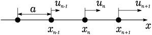 Рассмотрим одномерную периодическую цепочку атомов – одномерный кристалл с одним атомом в элементарной ячейке. Пусть период этой цепочки равен a. Тогда в состоянии равновесия координата -го атома цепочки xn равна na.