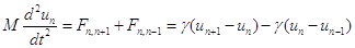 Обозначим через un смещение -го атома из положения равновесия. Будем считать, что атомы взаимодействуют только с ближайшими соседями. Сила, с которой (+1)–й атом действует на -й зависит от разности смещений этих двух атомов un+1–un. При небольших смещениях эту силу можно считать пропорциональной разности смещений: Fn,+1 = γ(un+1–un), где γ – коэффициент пропорциональности. Удобно представить, что атомы связаны друг с другом пружинками с жесткостью γ.
