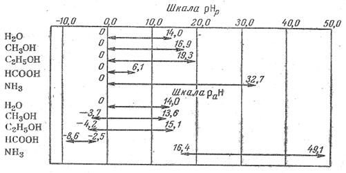 Измеренная по отношению к стандарту в данном растворителю рН не является абсолютном мерой кислотности неводного раствора и может быть использована для характеристики кислотности только в пределах данного растворителя. Это следует из того, что начало шкалы кислотности раНр =0 не соответствует равенству абсолютных активностей ионов водорода во всех растворителях. Величины раН нейтральных растворов в разных растворителях не совпадают друг с другом, так как протяженность шкал, зависящая от ионного произведения растворителя, различна. В верхней части рис. 1 в качестве примера приведены шкалы рНр в воде и не которых неводных средах. В воде шкала рН изменяется от 0 до 14; нейтральным раствором называется раствор с рН = 7. Если раствор имеет рН=0, это раствор кислоты с активностью ионов Н+, равной единице; если раствор имеет рН = 14, это раствор щелочи с активностью ионов ОН--, равной единице, но это не значит, что не может быть растворов в воде с рН меньше нуля и больше 14.
