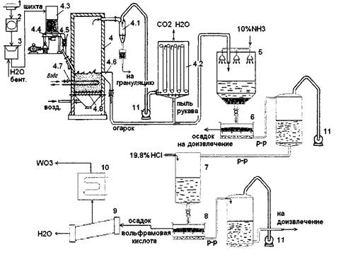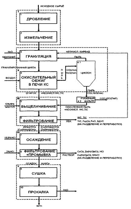 Огарок и пыль рукавного фильтра после окисления поступают в реактор для выщелачивания. Сверху шахты емкости распыляется 10%МНз при температуре 40°С с отношением тв/ж=1/3. При этом оксиды Ti, Fe; карбиды W, Ti и бентонит будут в осадке, а W, Co, Zn, Си перейдут в раствор.