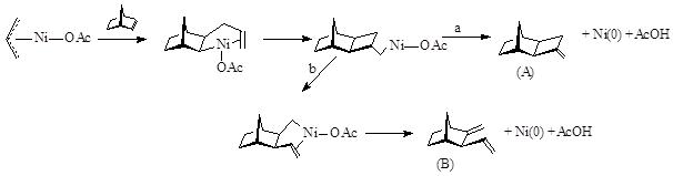 Этот процесс включает гидридное элиминирование после встраивания молекулы субстрата по связи Ni – аллил. В присутствии НБН образуется интермедиат А cis, exo – строения. Далее происходит замыкание четырехчленного кольца (направление a), с образованием cis, exo продукта I, имеющего метиленциклобутановый фрагмент. Реакция может реализовываться по направлению b с образованием продукта II (exo), имеющего метиленовую и винильную группу.