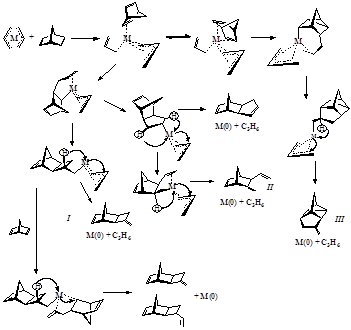 Крайне неустойчивые комплексы Fе(С3Н5) 3 и Со(С3Н5) 3 активно взаимодействуют с НБД уже при температуре его плавления (-19°С). Помимо продуктов с НБН-фрагментом I – II в значительных количествах образуется соединение с нортрициклановой структурой III. Такой набор продуктов обусловлен большими координационными возможностями железа и кобальта по сравнению с переходными металлами подгруппы никеля. Подобным образом с НБД взаимодействует Rh(С3Н5) 3, однако его активность в исследуемой реакции существенно ниже.