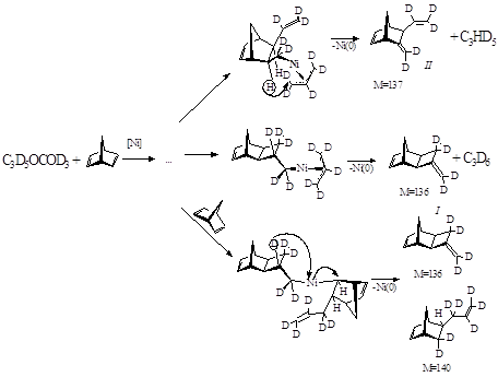 Ключевая стадия – β-гидридный перенос - подтверждается хромато-масс-спектрометрическим исследованием продуктов модельных систем: Ni(C3D5) 2 – НБД и Ni(С3Н5) 2 – НБД-D8. Их строение указывает на участие в процессе атомов водорода, принадлежащих как НБД, так и аллильному фрагменту и занимающих β-положение по отношению к металлу (рис.1.2).