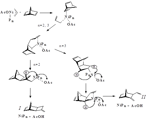 Механизм реакции основан на известных свойствах η3-аллильных комплексов: η3→ η1-изомеризации аллильных лигандов, внедрении ненасыщенных молекул по η1-связи металл-углерод, стадиях β-элиминирования и гидридного переноса, а также способности молекулы НБД как к монодентатной, так и хелатной координации.