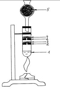 Ход работы: В пробирку (рис. 2.) наливаем свежеприготовленной хлорной воды (1). Вставляем в пробирку приготовленные резиновые кружочки- держатели (2) с отверстиями. В первый помещаем слой ваты, смоченный раствором KI и крахмала (3), во второй – слой ваты, смоченный раствором KBr (4). Закрываем пробирку хлоркальциевой трубкой, заполненной углем (5). Подогреваем хлорную воду в пробирке. Выделяющийся хлор реагирует с растворами KI и KBr. Наблюдается изменение окраски: слой ваты с бромидом калия приобретает красновато–коричневый цвет, вата с иодидом калия – синеет: 2KBr + Cl2 ® 2KCl + Br2, 2KI + Cl2 ® 2KCl + I2.