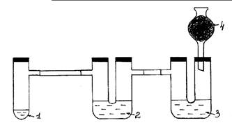 Ход работы: Собирают прибор согласно рис. 3. Установка должна быть герметичной. В пробирку Вюрца (1) помещают одну или две ложечки для сжигания кристаллического KMnO4 и соляную кислоту (конц.), немного превышающую уровень соли. Пробирку быстро закрывают пробкой. Выделяющийся хлор проходит сквозь толщу раствора KI в первой U-образной трубке (2). Наблюдают появление коричневой окраски и образование темно- фиолетовых кристаллов. Далее хлор проходит через раствор KBr во второй U–образной трубке (3), окисляя анион брома соли. Раствор приобретает красновато-бурый цвет. Излишки хлора поглощаются активированным углем в хлоркальциевой трубке (4). Закончив опыт, установку переносят в вытяжной шкаф, где проводят утилизацию растворов.