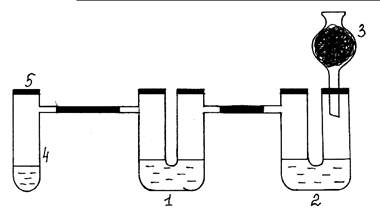 Ход работы: Собирают установку согласно рис. 4. В первую U–образную трубку (1) наливают раствор Na2S, во вторую – раствор Na2SO3 и 0,5 мл раствора NaOH (2). Правое колено второй трубки закрывают пробкой с хлоркальциевой трубкой, в которой находится активированный уголь (3). В пробирку Вюрца (4) насыпают кристаллический KMnO4 (одну или две ложечки для сжигания), приливают концентрированный раствор соляной кислоты немного выше уровня кристаллов соли и быстро закрывают пробирку пробкой (5). Выделяющийся во время химической реакции хлор проходит сначала в первую U-образную трубку. В толще раствора появляется сера. Затем хлор поступает во вторую U-образную трубку. Чтобы доказать, что здесь образовался продукт окисления – сульфат натрия, нужно внести раствор хлорида бария, проткнув иглой шприца резиновую трубку, (образуется осадок белого цвета). Затем добавить из шприца раствор соляной кислоты для растворения возможно образовавшегося BaSO3. Если осадок не растворяется, следовательно, в результате химической реакции хлор окисляет сульфит-ион до сульфат-иона.