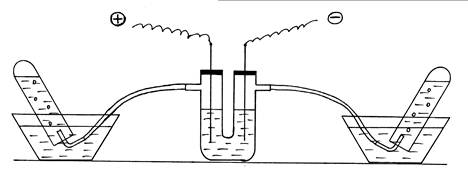 Оборудование и реактивы: Прибор для электролиза, две пробирки, два кристаллизатора, раствор NaOH (массовой долей 5-8 %), изогнутые газоотводные трубки, железные электроды.