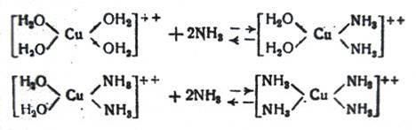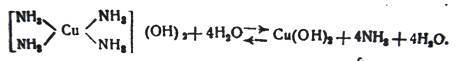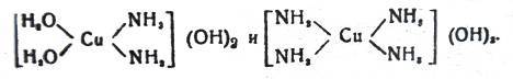 В первом случае устанавливается равновесие между купригидроксо- и куприамминовым ионами; причем в зависимости от того, какое количество аммиака содержится в водном растворе, в комплексном ионе замещаются на аммиак две или четыре частицы воды: