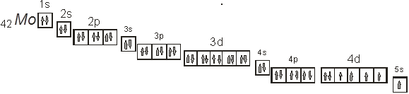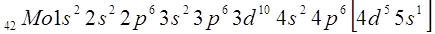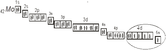 Покажем расположение валентных электронов в атоме молибдена. Как видно из электронной формулы молибден относится к d-элементам, поскольку у него заполняется 4d-подуровень.