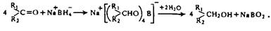 Щелочной раствор борогидрида натрия или калия при комнатной температуре быстро и селективно восстанавливает альдегидные и кетонные группы до спиртовых групп. В этих условиях он достаточно инертен по отношению к двойным связям, эпоксидным, сложноэфирным и карбоксильным группам. Механизм реакции заключается в присоединении гидрид-иона к карбонильному атому углерода, а атома бора к кислороду карбонильной группы с последующим гидролизом промежуточного боросодержащего комплекса. В этой реакции используются все четыре атома водорода борогидрида.