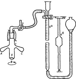 Навеску массой около 0,15 г воздушно-сухой целлюлозы помещают в среднюю часть в реакционного сосуда / и добавляют3 см раствора ортоборной кислоты концентрацией 0,1 моль/дм3, туда же помещают магнитную мешалку в стеклянной оболочке. В боковую камеру А пипеткой отмеряют точно 3 см3 раствора борогидрида натрия концентрацией в растворе гидроксида натрия концентрацией 0,1 моль/дм3, в боковую камеру С заливают 1 см3 раствора серной кислоты концентрацией 2 моль/дм3. Реакционный сосуд присоединяют к газовой бюретке объемом 50 см3 с помощью трехходового крана. Кран закрывают и, наклоняя реакционный сосуд, приливают раствор NaBH4 из боковой камеры А в среднюю часть В.