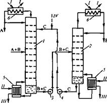 На рис.1.2 представлена схема разделения исходной смеси А+В методом экстрактивной ректификации с добавлением труднолетучегоразделяющего агента С, хорошо растворяющего компонент В. Компонент С подается на одну из верхних тарелок колонны 1 и вместе с флегмой стекает вниз по колонне. Растворяя в себе компонент В, разделяющий агент С понижает тем самым упругость его паров и способствует разделению А и В. Верхний продукт колонны 1представляет собой компонент А заданной чистоты, а нижний продукт — смесь В+С. Насосом 3эта смесь подается в колонну 2, где методом обычной ректификации получают компоненты В (верхний продукт) и С (нижний продукт). При этом колонна 2, как правило, отличается небольшой высотой и работает с небольшим флегмовым числом, поскольку компоненты В и С существенно различаются по температуре кипения (см. второе требование к экстрагирующему агенту). Экстрагирующий агент С насосом 4подают в колонну 1, замыкая цикл по компоненту С. Результатом работы по такой схеме является разделение исходной смеси А+В на отдельные компоненты А и В, причем некоторые потери разделяющего компонента С с этими продуктами восполняются.
