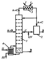 На рис.1.3. изображена принципиальная схема установки азеотропной ректификации при работе с разделяющим агентом С, образующим с компонентом А гомоазеотроп с минимумом температуры кипения. Разделяющий (азеотропообразующий) агент С подается в колонну 1 не выше точки подачи исходной смеси А+В, чаще всего - вместе с исходной смесью. Сверху колонны в виде гомоазеотропа отводятся пары смеси А+С, конденсируемые в конденсаторе 3, а снизу - в качестве кубового остатка - практически чистый компонент В. Гомоазеотроп из колонны азеотропной ректификации подлежит разделению (в особом узле 2) на компонент А необходимой чистоты и разделяющий агент С. Последний вновь возвращается в колонну азеотропной ректификации.