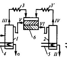 Рис. 1.4. Принципиальная схема установки гетероазеотропной ректификации. 1,2- колонны, 3, 3'- конденсаторы, 4,5- кипятильники, 6- флорентийский сосуд, I-исходная смесь; о, II- кубовые остатки в колоннах 1 и 2 соответственно; III, IV- составы паров из колонн 1 и 2; V,VI- составы равновесных слоев жидкости.