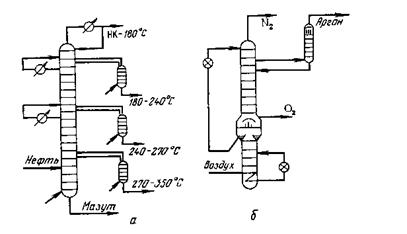 Рис. 1.5. Схемы промышленных ректификационных комплексов с частично связанными тепловыми потоками: а – с боковыми отпарными секциями для разделения сырой нефти на фракции; б – с боковой укрепляющей секцией для разделения воздуха на кислород, азот и аргон (14).