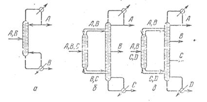 Колонны с выносными отпарными секциями, широко распространенные в нефтепереработке (установки первичной перегонки нефти, каталитического крекинга, разделения ароматических углеводородов, первичной перегонки бензинов и др.), и колонны с выносными укрепляющими секциями (например, комплексы для разделения воздуха с получением азота, аргона и кислорода) следует классифицировать, как комплексы с частично связанными тепловыми потоками. Промышленные комплексы с частично связанными тепловыми потоками показаны на рис.1.5. Эти комплексы занимают промежуточное место между комплексами со связанными тепловыми потоками и обычными схемами ректификации. По схеме разделения–это или схемы последовательного отделения тяжелых компонентов (колонны с выносными отпарными секциями) или схемы последовательного отделения легких компонентов (колонны с выносными укрепляющими секциями). Эти схемы имеют один общий дефлегматор и несколько кипятильников (вместо кипятильников на установках первичной перегонки нефти используют отпарку острым водяным паром) или один общий кипятильник и несколько дефлегматоров. Энергетические затраты на разделение в комплексах с частично связанными тепловыми потоками являются средними между затратами в комплексах с полностью связанными тепловыми потоками.