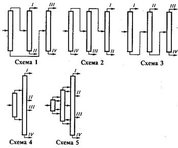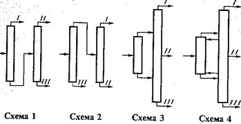 Рис. 1.8. Схемы разделения смеси на три продукта (17). I-III – продукты.